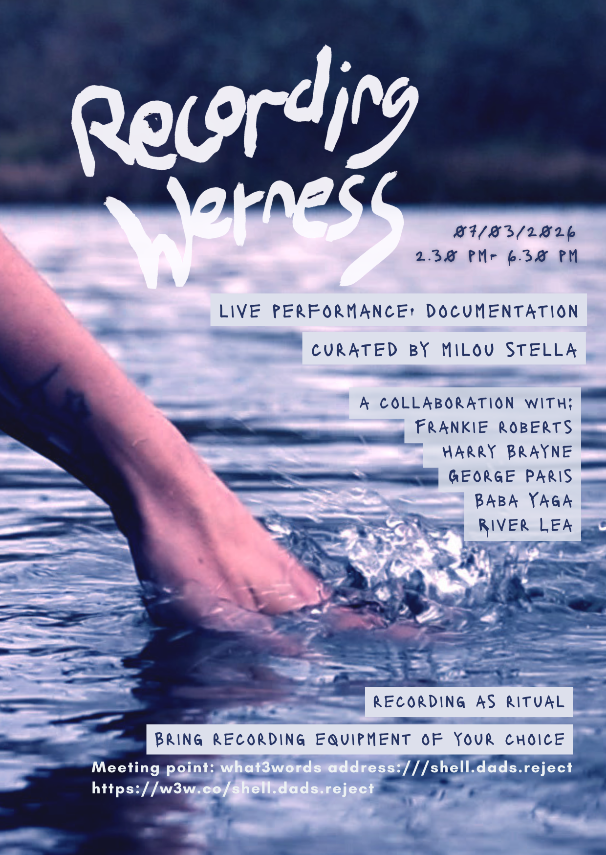 I want to invite you to Recording Wetness, a live performance and collective act of documentation unfolding along the River Lea. We will walk, listen closely to what pours, spills, streams,drops, and washes away. Together we will experiment with recording as ritual: holding small sounds, gestures, fragments, and letting myth leak gently into method.
