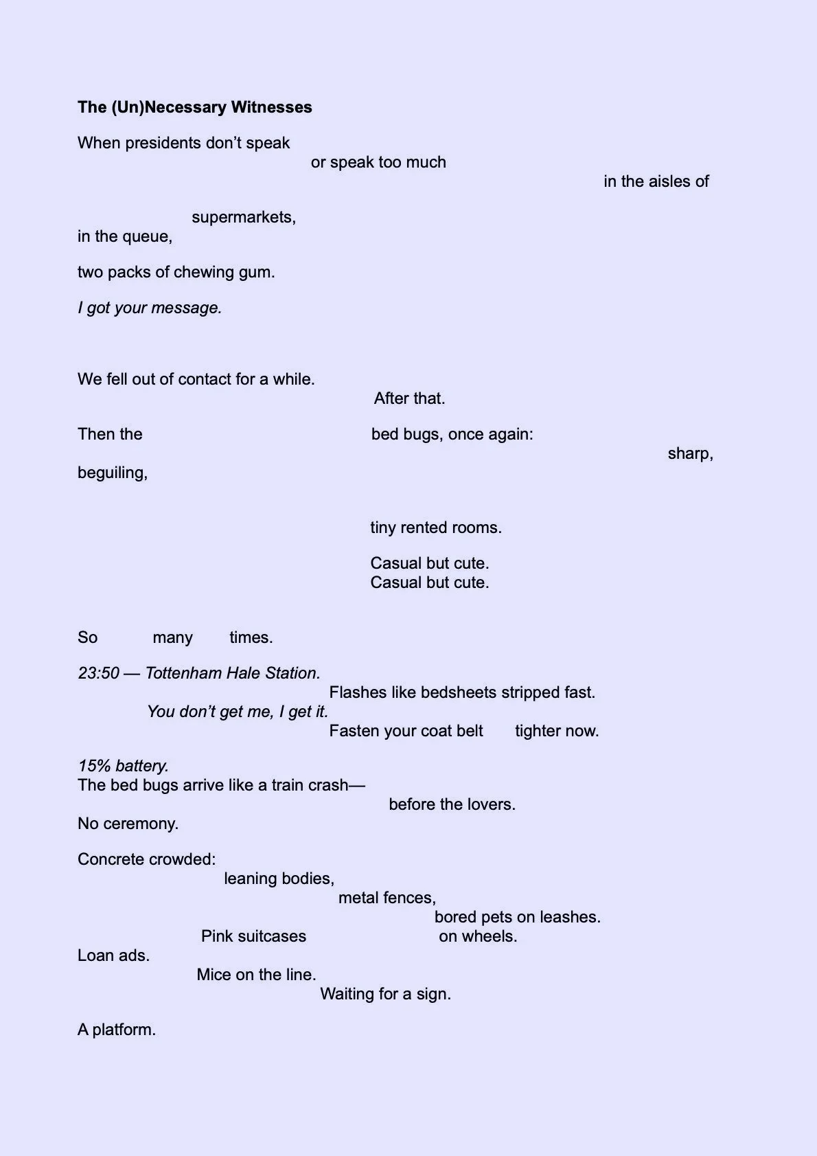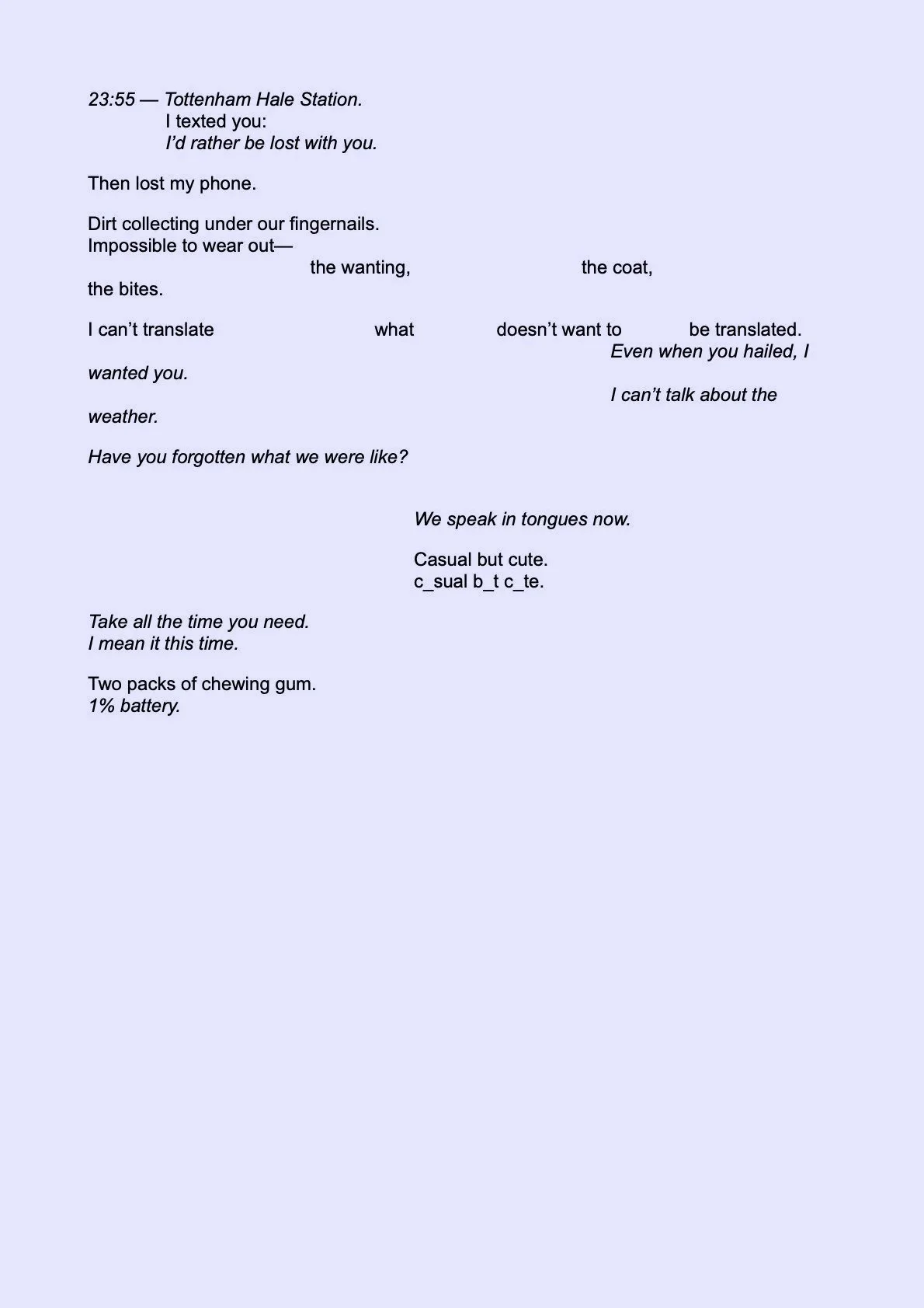 A piece of creative writing that resists linear narrative, using glitch, repetition and fragmentation to mirror the rhythms of memory, longing and online exchange. Rooted in neurodivergent, crip and queer temporalities, the text stages delay, disruption and refusal to upend the borders of archive, poem and story.